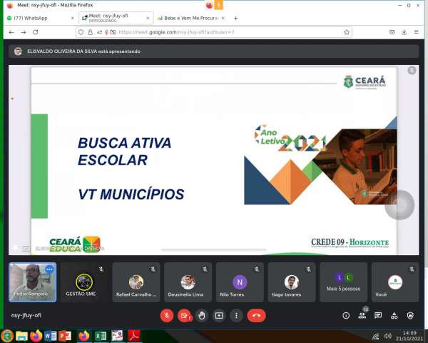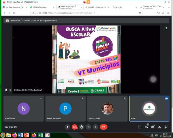 Na tarde de hoje, 21 de outubro de 2021, o Coordenador da CREDE 9, Pedro Henrique Sampaio, reuniu-se com o Orientador Elisvaldo Oliveira e o Técnico Pedagógico da CECOM, Rafael Carvalho, os Superintendentes da CEDEA, Ivanildo Tabosa e Lucieudes Pereira, e os responsáveis pela busca ativa dos municípios para discutir as ações do “Nenhum Aluno Fora da Escola” no contexto da retomada presencial.